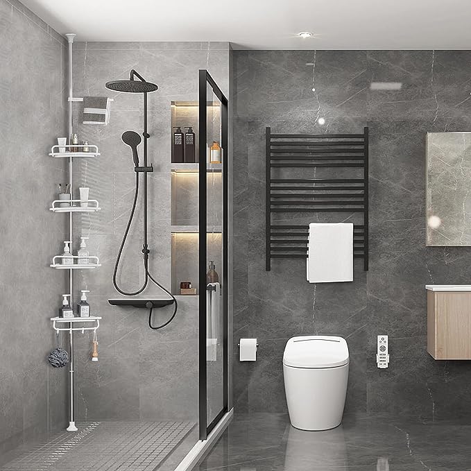 - Organización eficiente en la esquina de la ducha.